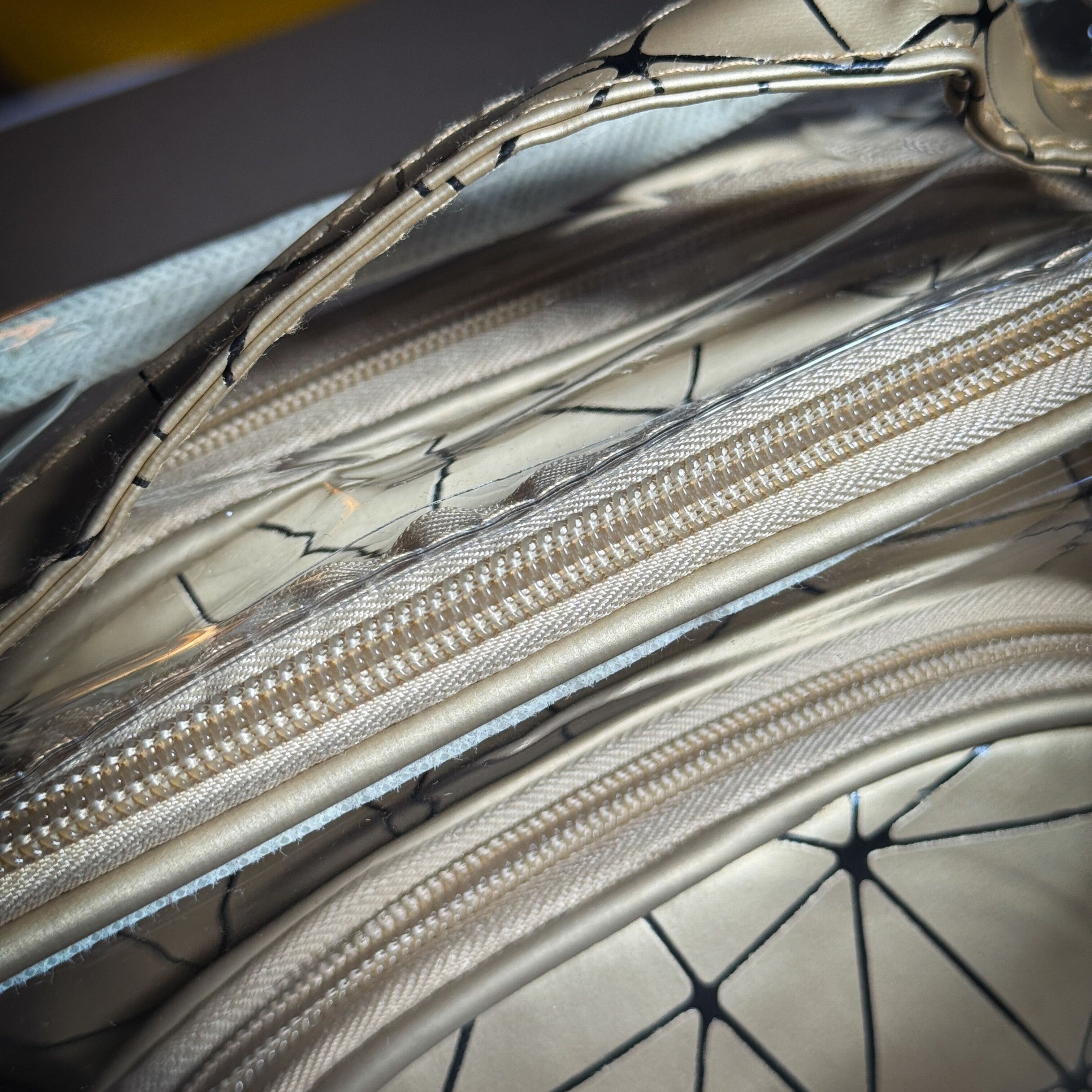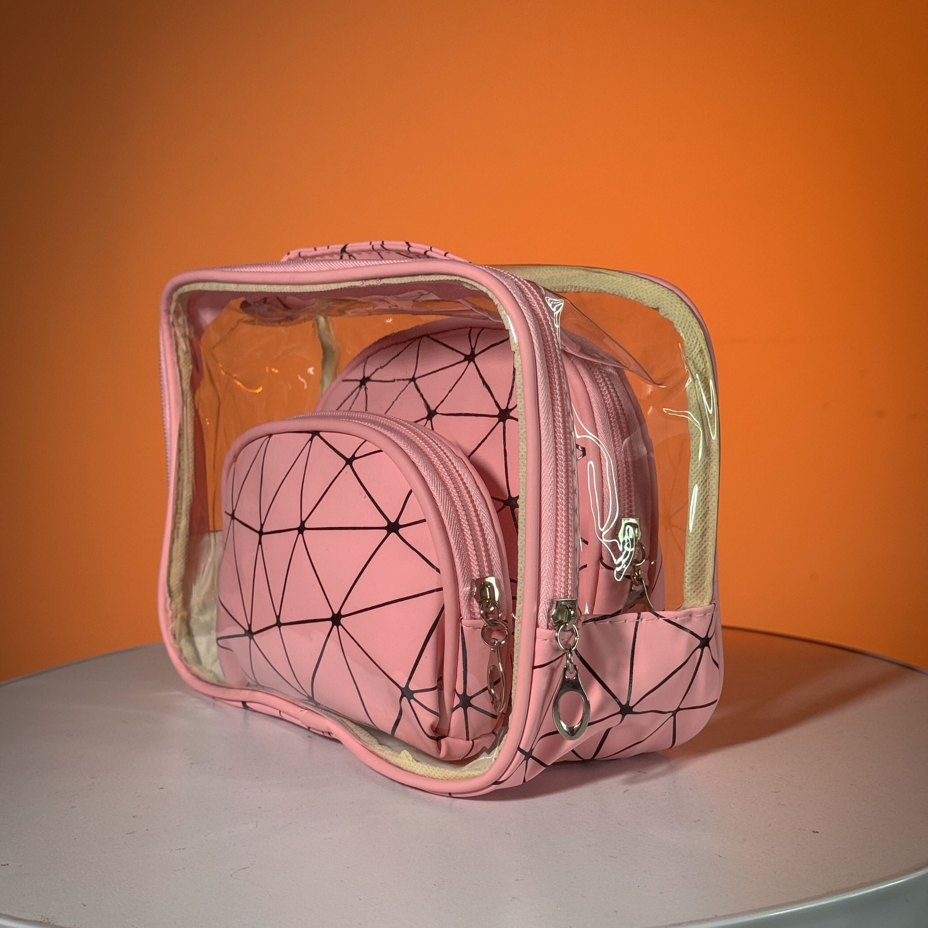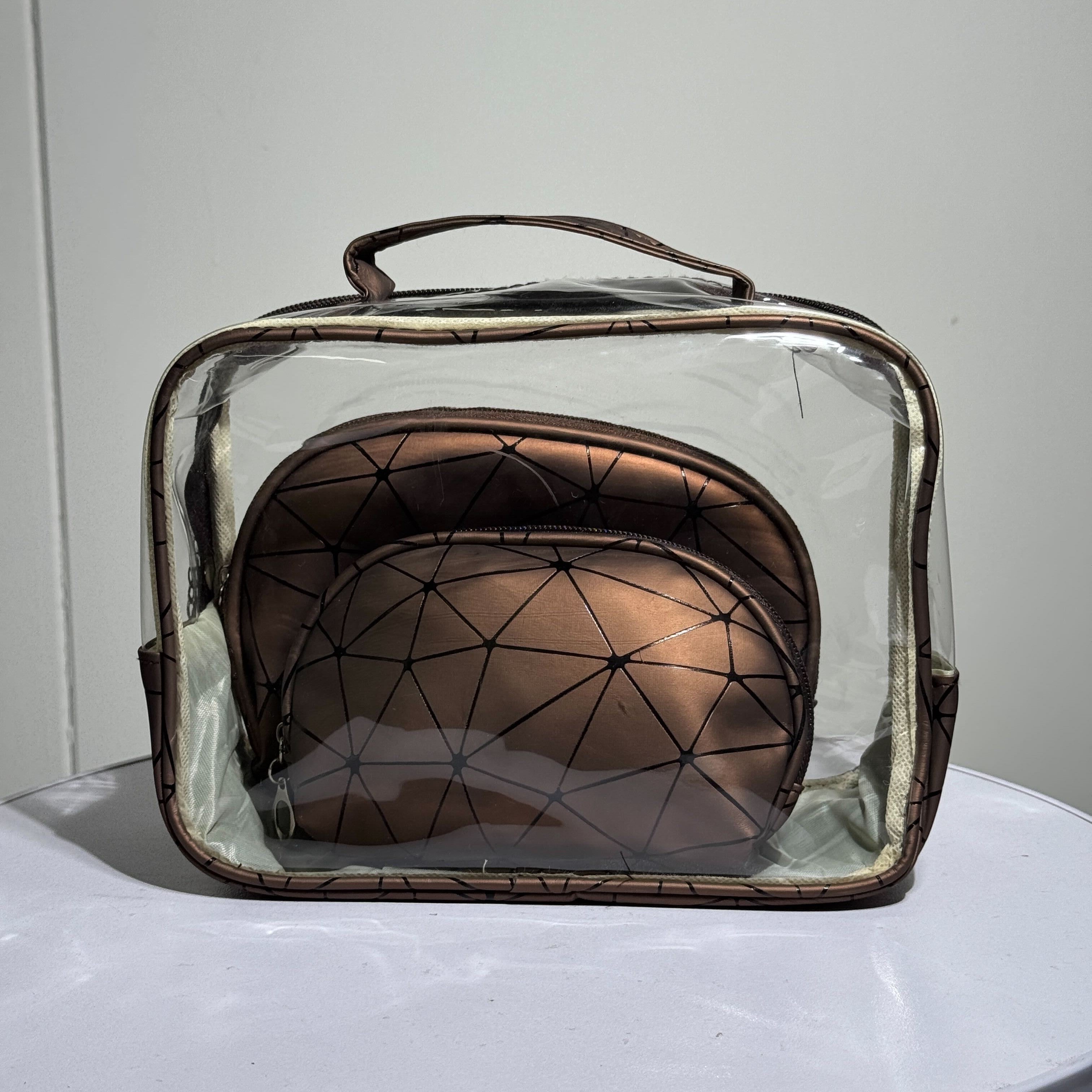 Keep your beauty essentials organized and easy to carry with this 3-piece makeup bag and pouch set. It includes a clear travel-friendly organizer and two stylish bronze pouches, making it perfect for both everyday use and trips.