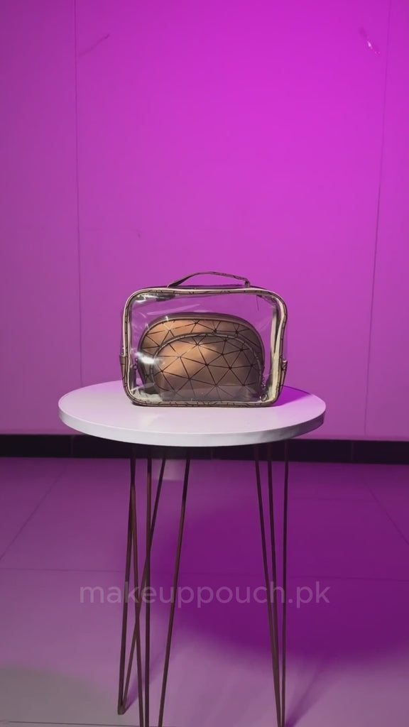 Keep your beauty essentials organized and easy to carry with this 3-piece makeup bag and pouch set. It includes a clear travel-friendly organizer and two stylish bronze pouches, making it perfect for both everyday use and trips.